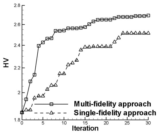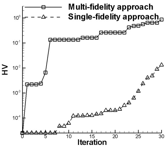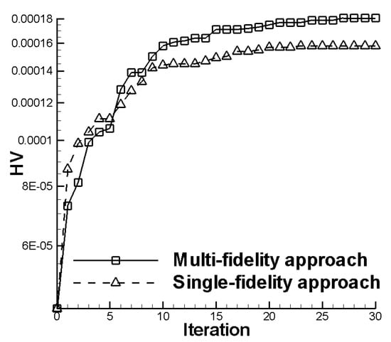 All the samples obtained by the two methods (the proposed multi-fidelity/multi-objective EGO and the single-fidelity/multi-objective EGO) are shown in Figure 11. These results show that the proposed multi-fidelity/multi-objective EGO can achieve greater diversity in the solution space than the single-fidelity/multi-objective EGO. The hypervolume of the proposed multi-fidelity/multi-objective EGO showed faster convergence (after 20 iterations) than that of the single-fidelity/multi-objective EGO (after 26 iterations). In addition, the non-dominated solutions of the proposed multi-fidelity/multi-objective EGO included ranging from 0.006 to 0.027 and ranging from 0.034 to 0.064. On the other hand, the non-dominated solutions of the single-fidelity/multi-objective EGO included ranging from 0.009 to 0.016 and ranging from 0.047 to 0.064. The histories of the hypervolumes of the two methods are compared in Figure 12. According to these results, the single-fidelity surrogate model could find only local optimum points, whereas the proposed multi-fidelity approach could find global optimum points.
