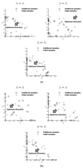 Initial sampling data and additional sampling data of three-objective test problem: (a) multi-fidelity approach; (b) single-fidelity approach.