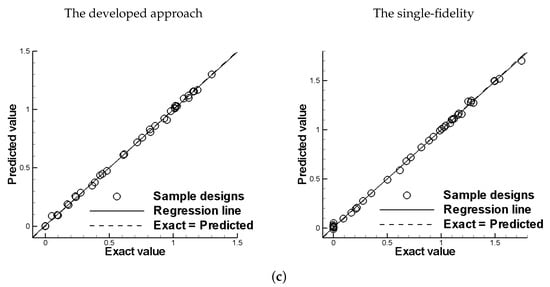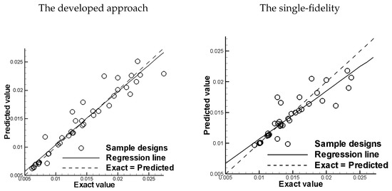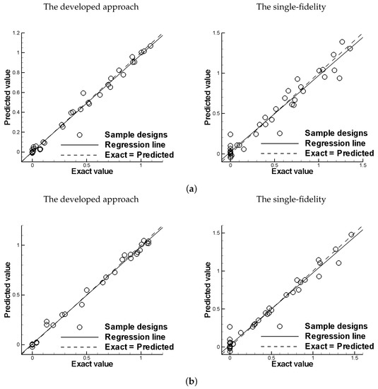 To investigate the reason for the superiority of the proposed multi-fidelity/multi-objective EGO, the cross-validation [29,30] of and was compared, as shown in Figure 6. It can be seen that the linear regression line nearly coincides with the predicted line in the case of the proposed multi-fidelity/multi-objective EGO. Thus, the multi-fidelity surrogate model achieves higher accuracy than the single-fidelity surrogate model. More specifically, the proposed multi-fidelity/multi-objective EGO achieves higher accuracy because the dataset obtained by low-fidelity evaluation enables the surrogate model to predict the solution in the uncertainty region.