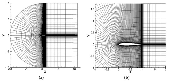 is a vector that consists of conservative quantities, and Q is the summation of conservative quantities entering and leaving the area. A lower-upper symmetric Gauss–Seidel (LU-SGS) implicit method [32] was employed for time integration, and a third-order-accurate upwind difference scheme with a monotone upstream-centered scheme for conservation laws (MUSCL) method [33] was employed for the flux evaluation. Further, the Baldwin–Lomax model [34] was used as a turbulent model. In addition, a structured grid was automatically created by an algebraic method for each design ( structured grid for the RANS solver, as shown in Figure 10). The computation time of CFD in this work is approximately 180 to 300 s.
