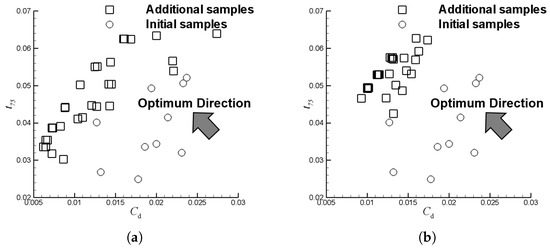 All the samples obtained by the two methods (the proposed multi-fidelity/multi-objective EGO and the single-fidelity/multi-objective EGO) are compared in Figure 15. In addition, the histories of the hypervolumes of the two methods are compared in Figure 16. These results show that the proposed multi-fidelity/multi-objective EGO achieves greater diversity of the non-dominated solutions because its hypervolume is larger than that of the single-fidelity/multi-objective EGO. The non-dominated solutions of the proposed multi-fidelity/multi-objective EGO included ranging from 0.007 to 0.022, ranging from 0.034 to 0.065 and ranging from 0.0938 to 1.054. On the other hand, the non-dominated solutions of the single-fidelity/multi-objective EGO included ranging from 0.010 to 0.022, ranging from 0.047 to 0.065 and ranging from 0.0938 to 1.039. Thus, the proposed multi-fidelity/multi-objective EGO achieved greater diversity of the solutions than the single-fidelity/multi-objective EGO. The cross-validation results for and are shown in Figure 17. It can be seen that the proposed hybrid surrogate model achieves higher accuracy than the single-fidelity kriging-based surrogate model. Thus, the proposed multi-fidelity/multi-objective EGO can achieve greater diversity of the solutions because its surrogate model achieves higher accuracy.