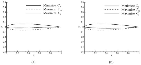 The second problem has three objectives: minimize at cruising speed, maximize and maximize the lift coefficient () in the landing condition at an angle of attack of 5.0. The optimization problem is expressed as: