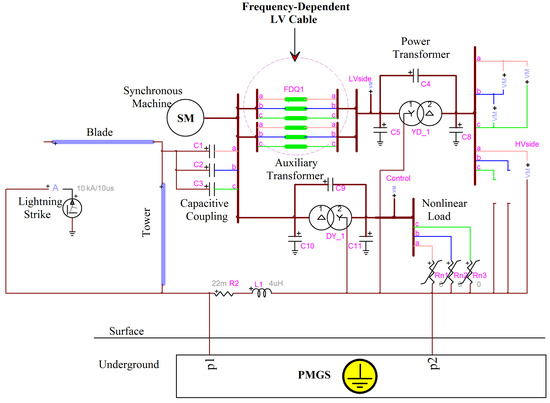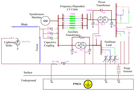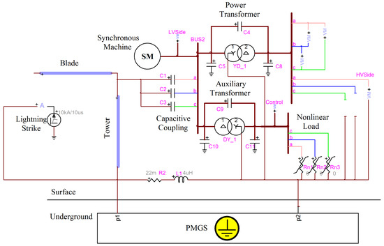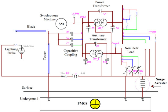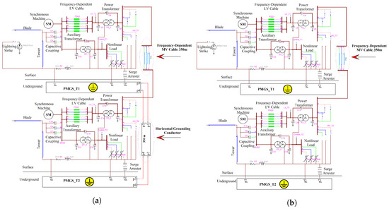 This section examines the impact of the PMGS on the rate of overvoltages at the set-up (boost) transformers and control circuits in two diverse case studies, a single wind turbine and a pair of turbines. Based on the installation of several additional electrodes either at the local transformer or on the tower grounding side and adding two rings to increase the stability and reliability of grounding protection from the PMGS model (see Figure 1), the influence of other high-frequency components such as high-frequency SA and FD cables are taken into account to arrive at a completely safe model for further transient studying.
