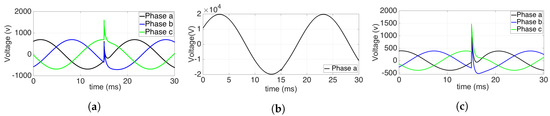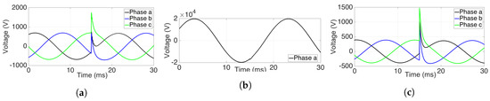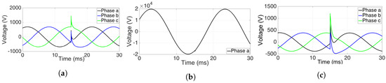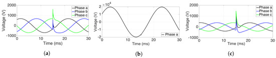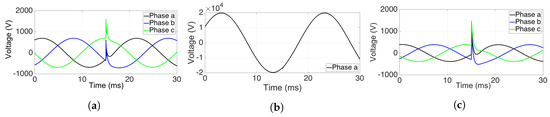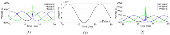 Impact of PMGS on transient overvoltages. (a) LV side of the main transformer; (b) HV side of the main transformer from node to ground; (c) control circuits.