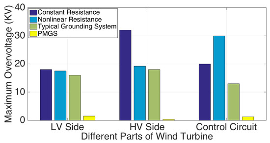 Figure 4 presents a comparison of previously-designed models (see Section 2.6) and the PMGS. At first glance, it is clear that transient voltages in the constant resistance model have the highest values, so that in the worst condition, they escalate to 36 kV at the control circuit. Like constant resistance, nonlinear resistance did not considerably diminish the rate of overvoltage on the LV side; however, the peak value was reduced by on the HV side and at the control circuit. Despite improving the grounding model over the typical expanded grounding system, nonlinear resistance was unable to limit the peak value to the level that can be withstood by wind turbine equipment. In the best condition, the peak value decreased to 13 kV at the control circuit, which is still higher than the upper limits. Finally, the PMGS seems to be successful in suppressing transient voltages that exceed upper limits, as the overvoltages reduce to 1.5 kV and 1.2 kV, respectively, on the LV side and at the control circuit. Moreover, the overvoltage is less than one hundred volts on the HV side, which is negligible.