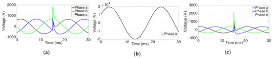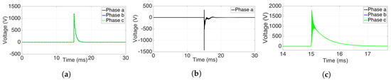 Impact of direct strike on out-of-service wind turbine overvoltages. (a) LV side of the main transformer; (b) HV side of the main transformer from node to ground; (c) control circuits.