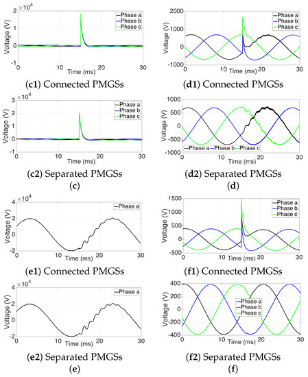 As Figure 16a–c shows, even though connecting PMGSs in a pair of turbines can reduce the peak overvoltages from 60 kV–50 kV at the control system, from 75 kV–60 kV on the HV side and from 20 kV–14.5 kV on the LV side of the first wind turbine, they still remain much higher than the upper limits the electrical devices can withstand. However, in contrast to the first turbine, the second tower does not suffer from hazardous overvoltages and can bear such transitions without disruption (see Figure 16d–f).