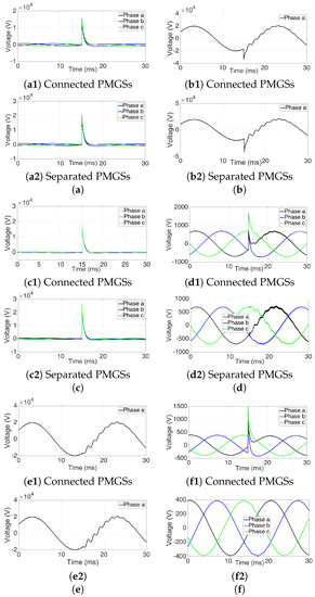 In the following, the advantages obtained from the PMGS are explained through measuring the voltages of the wind turbine and the pair of turbines during lightning in diverse conditions.