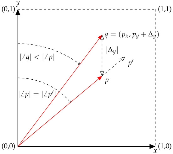 Consider the trivial case where two audio signals are to be mixed, where only the absolute levels of each signal can be adjusted. In Figure 1, the gains of two signals are represented by x and y, where both are positive-bound. Consider the point p as a configuration of the signal gains, i.e., . From this point, the values of x and y are both increased in equal proportion, arriving at the point . The magnitude of p is less than that of () yet since the ratio of x to y is identical, the angles subtended by the vectors from the y-axis are equal (). In the context of a mix of two tracks, what this means is that the volume of is greater than p, yet the blend of input tracks is the same.