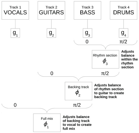 Figure 3 represents a comparable 4-track mixing exercise, as described in [7]. The four audio sources were specifically chosen for this example (vocals, guitar, bass and drums) and assigned to , , and respectively. Consequently, the set of mixes is represented by a 3-sphere of radius r. Due to the deliberate assignment of tracks in this example, the parameters and represent a set of inter-channel balances which, due to the specific relationships of instruments, have importance to musicians and audio engineers: determines the balance of bass to drums, the rhythm section in this case; describes the projection of this balance onto the axis, i.e., the blend of guitar to rhythm section, and finally, describes the balance of the vocal to this backing track.
