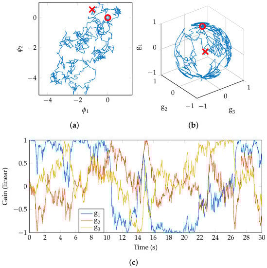 As each point in represents a unique mix, the process of mixing can be represented as a path through the space. In Figure 4a, a random walk begins at the point marked ‘∘’ in the 2D mix-space (the origin [0,0], which corresponds to a gain vector of [1,0,0]). The model for the walk is a simple Brownian motion (http://people.sc.fsu.edu/~jburkardt/m_src/brownian_motion_simulation/brownian_motion_simulation.html). After 30 s, the walk is stopped and the final point reached is marked ‘×’. The gain values for each of the three tracks are shown in Figure 4b and it is clear that the random walk is on a 2-sphere, as anticipated. The time-series of gain values is shown in Figure 4c. Note that , so for positive g the region explored is as represented in Figure 2b.