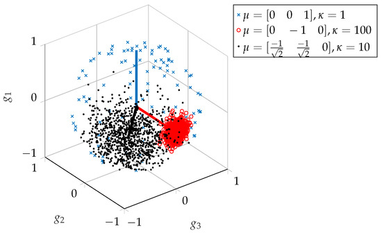 Here, is the modified Bessel function of the first kind at order v. The parameters and are called the mean direction and concentration parameter, respectively. The greater the value of , the higher the concentration of the distribution around the mean direction , resulting in lower variance. The distribution is unimodal for and is uniform on for . Further details can be found in [12,13]. The SphericalDistributionsRand (https://github.com/yuhuichen1015/SphericalDistributionsRand) code, based on the work of [14], was used to generate points according to a vMF distribution. In the context of audio mixes, (where ) represents the mix about which others are distributed, akin to the mean in a normal distribution. The term represents the diversity of mixes generated, analogous (but inversely proportional) to variance. An example is shown in Figure 5, where three distributions are drawn from a 2-sphere.