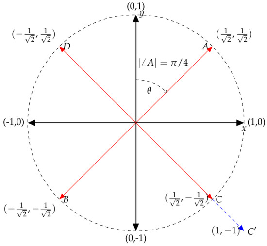 While the examples so far have used polar and spherical coordinates, for and respectively, to extend the concept to any n dimensions, hyperspherical coordinates are used. The conversion from Cartesian to hyperspherical coordinates is given below in Equation (5). The inverse operation, from hyperspherical to Cartesian, is provided in Equation (6), based on [11]. Here, is the gain of the jth track out of a total of n tracks. The angles are represented by . By convention, is the equatorial angle, over the range radians, while all other angles range over radians.