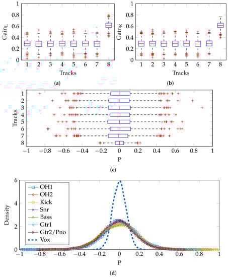 The method for random gains (see Section 2.2) was used to create separate mixes for the left and right channels of a stereo mix. In absolute terms, hard-panning only exists when the gain in one channel is 0 (perceptually, the impression of hard-panning can be achieved when the difference between one channel and the other is sufficiently large [18]). Since the vocal boost prevents any vocal gain of zero, the panning of the vocals is much less wide than the other tracks. Additionally, since was chosen to prevent any negative gains, there are few zero-gain instances; therefore, there is a lack of hard-panning. Figure 8a,b show the gain settings produced and a boxplot of the resulting pan positions is shown in Figure 8c, where the inter-quartile range extends to ±0.4 for the seven instrument tracks and about ±0.2 for the vocals. The estimated density of pan positions for each track is shown, illustrating the relatively narrow vocal panning. As expected, these estimated density functions are Gaussian, to a good approximation.