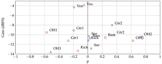 Figure 9 shows the difference in gains produced for left and right channels. There were some negative track gains produced: when generating audio mixes, the absolute magnitude of the gain was used to avoid phase inversions which would alter spatial perception of the stereo overhead pair. It is clear that the similarity of vocals gains in left and right channels produces a limited variety of pan positions close to the central position, as shown in Figure 9c,d. Other instruments are panned with mean position and variance in accordance with the experimental results [15].