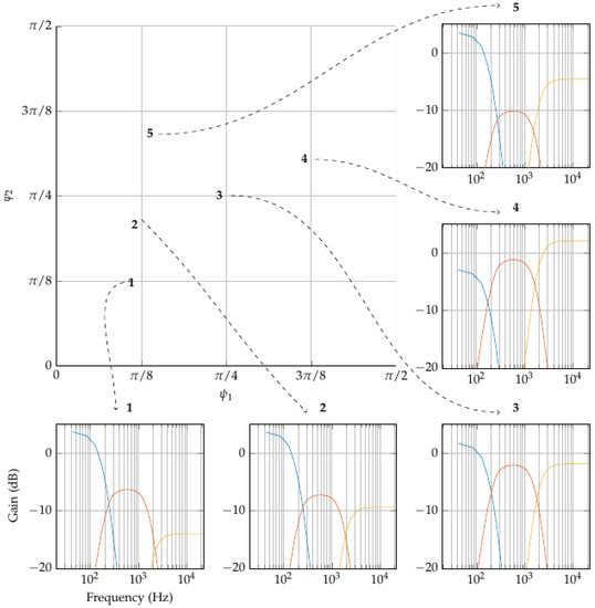 In Figure 12, five points are randomly chosen in the tone-space. These co-ordinates are converted to three band gains as before, except that, in order to centre on a gain vector of , , which is in this example. Of course, this method can be used for any number of bands.