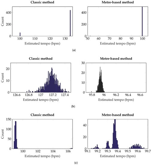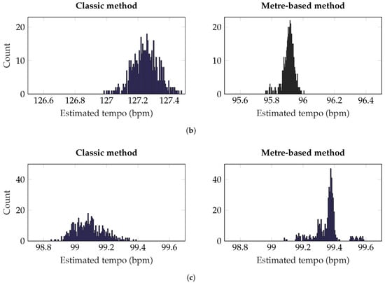 Estimated tempo for three songs, 500 mixes each using Equation (7). In each histogram, the data is split into 100 bins. Overall, performance is better for the metre-based method, as it demonstrates greater accuracy and improved robustness to changes in the mix. (a) “Burning Bridges”—The correct tempo is ≈100 bpm; (b) “I’m Alright”—The correct tempo is ≈96 bpm; (c) “What I Want”—The correct tempo is ≈99 bpm.