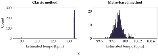 Figure 13a and Figure 14a show the results for “Burning Bridges”, where it is clear that the classic method performs poorly. The correct tempo of 100 bpm is estimated for only a small percentage of the mixes while all others are estimated close to 133 bpm (see Figure 14a). This leads to a high mean squared error (MSE) as shown in Table 1. A similar flaw is evident for “I’m Alright” where the tempo is again overestimated by roughly 33% for both mix distributions (see Figure 13b and Figure 14b). This indicates a consistent error in the tempo-estimation routine, which is being revealed by these mix distributions. The metre-based method performs much better, estimating the correct tempo in almost all cases and exhibiting a lower MSE, with only a small amount of absolute error (0.1–0.2 bpm). The performance of the classic tempo-estimation method is improved for “What I Want”, where both methods are found to have a high level of accuracy, as shown in Figure 13c and Figure 14c. For both distributions, the metre-based version produces clusters of solutions for “What I Want”, although the tempo represented by largest cluster is consistent.