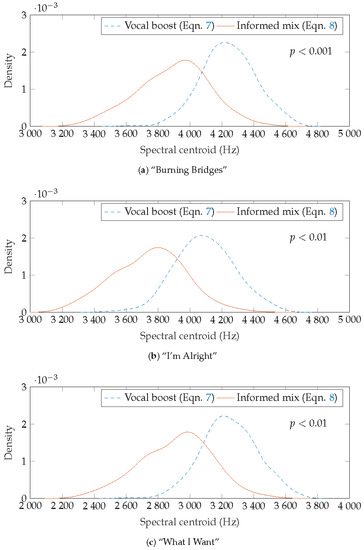 The experiment was conducted as follows. Using Equation (7) and , a set of 500 gain vectors was generated. For each of these vectors, a mix was created and the spectral centroid was measured. This resulted in 500 measurements of spectral centroid, the density of which was estimated using Kernel Density Estimation (KDE). This procedure was repeated for a second set of 500 mixes, generated using Equation (8) and . The estimated density distribution of both is plotted in Figure 15. These distributions were compared using a Wilcoxon rank sum test, which tests the null hypothesis that the distributions of both samples are equal. This null hypothesis was rejected in each case, as shown by the p-values in each subplot of Figure 15 ( in each case).