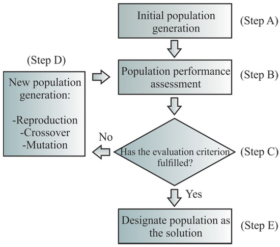 GA is one of the most employed methods to solve optimization problems, since global optimal solutions can be found [30]. A flow chart of the stages required for implementation of the GA is shown in Figure 2. In Step 1, the initial population is generated, usually randomly, to ensure a diversity of potential solutions. In Step 2, the population is evaluated in one or more objective functions in order to find the best individuals and their fitness values, which are used in the next Step 3. In this step, it is checked if the population fulfills the criterion established to end the algorithm execution. If the population cannot be considered as the solution, an additional step (Step 4) must be executed, where the genetic operators (reproduction, crossover, and mutation) are applied to obtain a new population. The reproduction employs the best individuals, which have the highest fitness value, to be part of the new population. On the other hand, the crossover operation uses the current best individuals to create new ones employing several crossover points, at the same position in the used individuals. The delimited parts are swapped to create the new individuals. A crossover probability value is used to select the order of swap. Finally, the mutation modifies specific position values according to a mutation probability value. It should be noticed that the abovementioned operators manipulate the individuals in bit manner, i.e., the operations are performed in a bit-to-bit basis. Once the new population is created, they are evaluated and tested until the stop criterion is reached. When the algorithm finalizes its execution, the final population is designated as the problem solutions (Step 5).