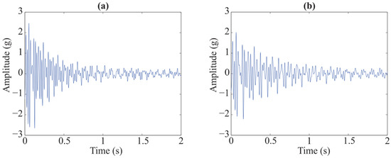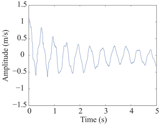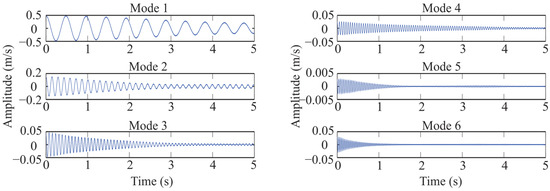 Using the proposal, the acquired vibration data are transformed to the to free-damped vibration form using NExT method. In an analogous way to the previous example, sensor 8 is used as the reference signal to estimate the free-decay response, since this sensor is far away from selected sensor 4 to estimate the modal parameters of structure. In this case, sensor 8 satisfies this specification recommended by Caicedo [52]. In this example, 1000 samples signal are selected to estimate the free-damped vibration form. This means that the original signal is converted to a new signal of 5.0 s, as shown in Figure 12. This number of samples is sufficient to estimate the free-damped form. Then, once obtained the free-damped response, it is processed by SWT in order to extract the individual modes contained in the signal, which are illustrated in Figure 13.