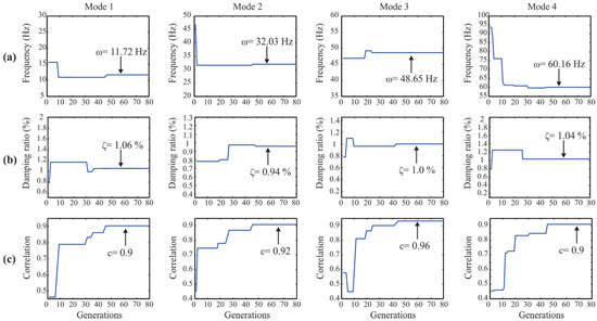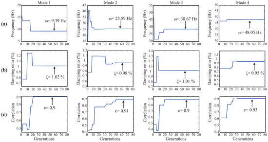 Convergence graphs of the: (a) natural frequency; (b) damping ratio; and (c) correlation value for the x-direction modes.