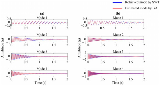 Once the obtained values with the proposed objective functions in Equations (12) and (14) are evaluated, the next step is to verify the criterion for stopping the generation of new populations. In this regard, it is used the maximization criterion of the objective functions, since it is desired to calculate the highest correlation value, because it will indicate that the signal, constructed with Equation (7), has the most resemblance with the mono-component obtained by SWT. If the criterion is not achieved; then, it is necessary to create a new population based on the current one. To this purpose, the best individual, the one that produces the signal with the highest correlation value with respect of the in-test one, is used directly as the first individual of the new generation. The other individuals are created using the crossover operator with the best individual of the former generation and the two remaining individuals. After investigating the number of different crossover points, the four-point crossover is used in this paper with a small mutation probability value, since this value must reflect its real-life counterpart [48,49]. Further, both the crossover and mutation probabilities are usually selected according to the desired application [50]. In this work, it is found that 0.5 and 0.007 are the crossover and mutation probability values that allow obtaining the best results. The abovementioned procedure is repeated until no improvements of the correlation value in a certain value of iterations, and for each retrieved mode by SWT. It should be pointed out that the combination of the abovementioned objective functions, Equations (12) and (14), allows avoiding the utilization of schemes to smooth the envelop, since it is only used for comparison purposes in the proposed approach, unlike the work presented in [11], which uses it as a fundamental part of the estimation of the modal parameters formulas, making the proposal inherently more robust to the aforementioned variations of the envelop form.