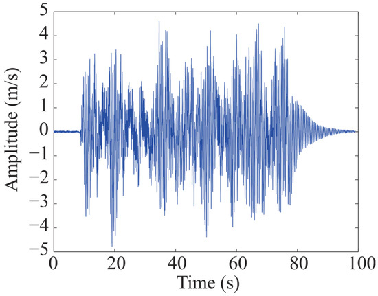 In order to evaluate the performance of the proposed methodology under real-life conditions, the eight-story steel frame experimental data are used to estimate its natural frequencies and damping ratios. A graphical illustration of the structure is shown in Figure 10. The building has H-shaped columns with dimensions of 1.5 m × 1.1 m × 9.44 m (width, length, and height). Additionally, lead plates of 250 kg are piled on each floor; hence, each floor has a total mass of 325 kg. The base of the building was subjected to white noise excitation in the long-span direction. This structure is located in the National Center for Research on Earthquake Engineering, Taiwan, and is also used by Su et al. [53]. The responses were measured using eight velocity sensors distributed on the eight stories and located at the center of each floor. The sensor employs a sampling rate of 200 Hz during 100 s, thus each signal contains 20,000 samples. The measured vibration response of sensor 4 is used indistinctly to estimate the modal parameters of the structure. Figure 11 depicts the signal measured by sensor 4.