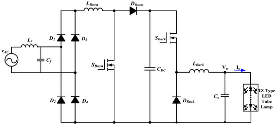 Latest developments and applications of solid-state lighting have begun gaining greater attention due to the requirements for efficient energy usage nowadays [1,2,3,4,5,6,7,8,9,10,11,12,13,14,15,16]. With features of energy-savings, lower maintenance costs and long lifetime, light-emitting diode (LED) tube lamps have begun to be favorable alternatives to replace traditional T8/T10-type fluorescent lamps in building-lighting applications [17,18,19]. According to the specifications shown in [20,21] with almost the same color temperature and color-rendering index, the LED tube lamp has better lighting efficiency, less power consumption, longer lamp lifetime, and contains no mercury inside the lamp tube, as compared to its T8-type counterparts. Therefore, T8-type LED tube lamps have become increasingly popular lighting sources for indoor lighting applications such as public architecture, offices, classrooms, and so on [17,18,19,20,21]. Figure 1 shows the commercial two-stage driver for supplying a T8-type LED tube lamp; it is composed of an AC-DC (alternating current-direct current) converter (typically a boost converter) with power-factor corrections (PFCs) as the first stage, and a DC-DC converter (typically a buck converter) as the second stage for regulating the voltage/current of the LED tube lamp. Separate controllers for each stage are required, and the circuit efficiency is restricted due to the two-stage power conversion. Some single-stage AC-DC drivers for providing a T8-type LED tube lamp to replace T8/T10-type fluorescent lamps have been presented: reference [18] utilizes a flyback PFC converter, and a buck converter with input-current shaping is presented in reference [19]. These single-stage versions are cost-effective in comparison to their two-stage counterpart; however, their power switches do not include the soft-switching function, which results in limited efficiency.