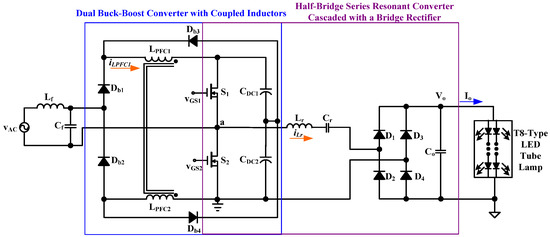 Figure 2 shows the presented driver, which integrates the dual buck-boost converter with coupled inductors (one buck-boost converter includes a diode Db1, a coupled inductor LPFC1, a switch S1, a body diode of the switch S2, and a DC-linked capacitor CDC1; another buck-boost converter includes a diode Db2, a coupled inductor LPFC2, a switch S2, a body diode of the switch S1, and the capacitor CDC2) with the half-bridge series resonant converter cascaded with a bridge rectifier (including two DC-linked capacitors CDC1 and CDC2, two switches S1 and S2, a resonant inductor Lr, a resonant capacitor Cr, a full-bridge rectifier (including diodes D1, D2, D3 and D4), and an output capacitor Co) into a single-stage topology for supplying an LED tube lamp [17]. In addition, an LC filter (an inductor Lf and a capacitor Cf) is connected with the input utility-line voltage.