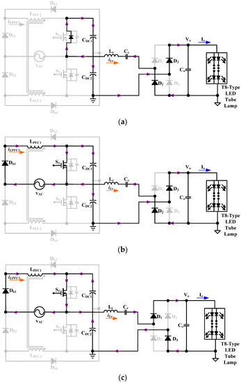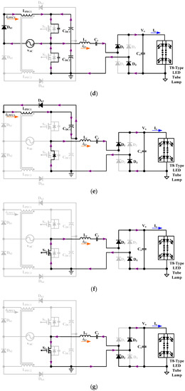 The operating modes and key waveforms of the presented LED tube lamp driver during the positive half-cycle of input utility-line voltage are shown in Figure 3 and Figure 4, respectively, and the analysis of operations for the presented driver are described in detail as follows.