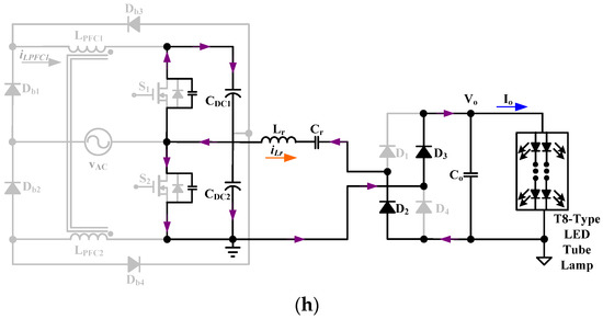 Operation modes of the presented driver during the positive half-cycle of input voltage vAC. (a) Mode 1; (b) Mode 2; (c) Mode 3; (d) Mode 4; (e) Mode 5; (f) Mode 6; (g) Mode 7; (h) Mode 8.