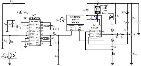 Figure 5 shows the circuit diagram for controlling the single-stage LED tube lamp driver. Referring to Figure 5 and utilizing a constant voltage/current controller (IC1 SEA05) for regulating the LED tube lamp’s output voltage and current, the output voltage Vo can be sensed through resistors Rvs1, VR1 and Rvs2, and the output current can be sensed through resistor R3. The sensed output signal from pin 5 of the IC1 feeds into the high-voltage resonant controller (IC3 ST L6599) through a photo-coupler (IC2 PC817). Two gate-driving signals vGS1 and vGS2 are generated from pin 15 and pin 11, respectively, of the IC3, to carry out regulating the LED tube lamp’s output voltage and current. In addition, an AC-DC switching power module with dual output voltages is utilized for providing the 15 V power supply voltages of IC1 and IC3 in the control circuit.
