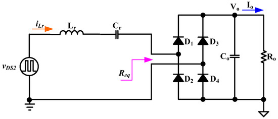 Figure 6 depicts the equivalent circuit during the design of the series resonant tank; Ro is the equivalent resistance of the T8-type LED tube lamp, and can be represented by Ro = Vo/Io. By using the fundamental approximation theory, the fundamental components of the switch voltage vDS2 can be expressed by [23,24]