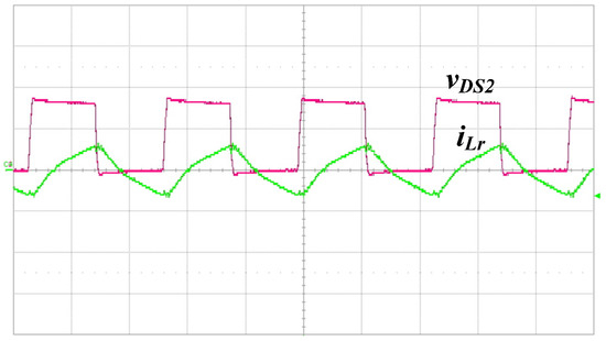 Measured voltage vDS2 (200 V/div) and inductor current iLr (1 A/div); time scale: 5 μs/div.