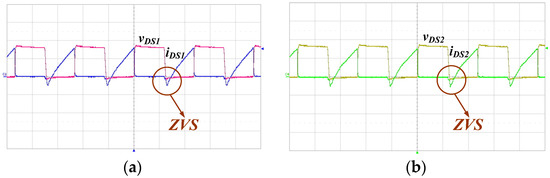 (a) Measured voltage vDS1 (200 V/div) and current iDS1 (1 A/div); time scale: 5 μs/div; (b) Measured voltage vDS2 (200 V/div) and current iDS2 (1 A/div); time scale: 5 μs/div.