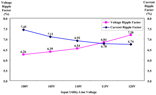 Figure 11 shows the measured output voltage and current waveforms, and the average values of Vo and Io are 60 V and 0.3 A, respectively. Table 2 presents the measured output voltage and current of the presented LED tube lamp driver under different input voltages. Figure 12 shows the calculated voltage and current ripple factors of the presented LED tube lamp driver under different input utility-line voltages. In addition, the output voltage (current) ripple factor is obtained by the peak-to-peak (pk–pk) level divided by the average value of output voltage (current). According to Figure 12, the highest and lowest measured output-voltage ripple factors are 7.2% and 6.26%; these occurred at a utility-line rms voltage of 120 V and 100 V, respectively. Moreover, the highest and lowest measured output-current ripple factors are 7.45% and 6.74%; these occurred at a utility-line rms voltage of 100 V and 120 V, respectively.