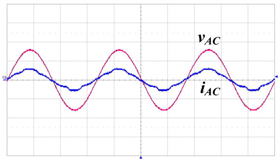 Measured input utility-line voltage vAC (100 V/div) and current iAC (0.5 A/div); time scale: 5 ms/div.