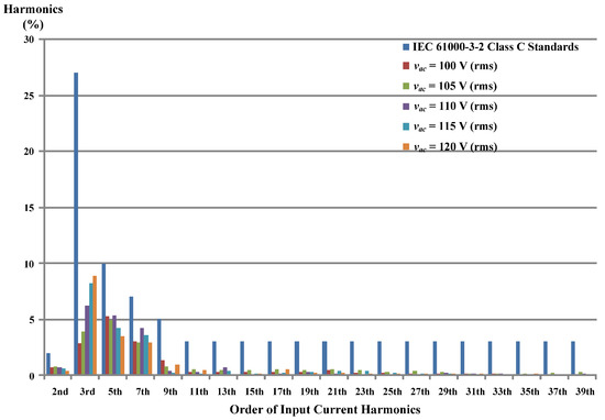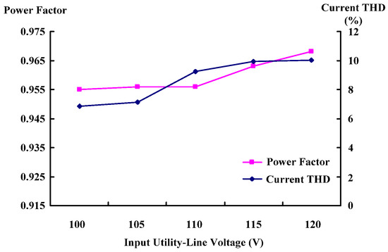 The measured input utility-line voltage and current are shown in Figure 13, and the input current is in phase with the input voltage. Figure 14 presents the measured input-current harmonics compared with the International Electrotechnical Commission (IEC) 61000-3-2 Class C standards under input utility-line voltages ranging from 100 V to 120 V; all measured current harmonics meet the requirements. Figure 15 shows the measured power factor (PF) and current THD at input utility-line voltages ranging from 100 V to 120 V. At a utility-line rms voltage of 110 V, the measured PF and current THD are 0.96 and 9.3%, respectively. The maximum PF is 0.97 occurred at a utility-line rms voltage of 120 V, and the minimum current THD is 6.9% occurred at a utility-line rms voltage of 100 V.