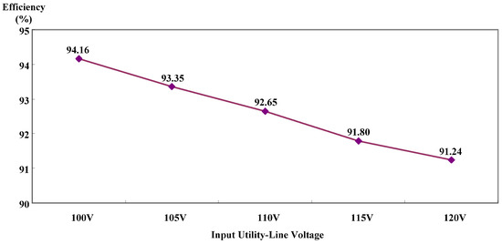 Figure 16 shows the measured efficiency of the presented LED tube lamp driver under input utility-line voltages from 100 V to 120 V. The highest and lowest measured efficiency levels are 94.16% and 91.24%; these occurred at utility-line rms voltages of 100 V and 120 V, respectively. In addition, the efficiency which drops with increased utility-line voltages is related to the voltage gain of the LC series-resonant tank. For providing rated output power (voltage/current), the voltage gain of the LC series-resonant tank will decrease when the utility-line voltages increase, resulting in increasing the switching frequency of the power switches. Thus, the switching losses of power switches and conduction losses of power diodes will increase resulting in lowering the circuit efficiency.