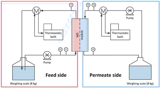 The direct contact membrane distillation (DCMD) experiments were carried out using the experimental setup described in [32]. The process scheme of the setup is visualized in Figure 1. The module had a membrane area of 0.0108 m2 and 2 mm thick polypropylene (PP) spacers were used. The feed and permeate temperatures were kept constant at 60 and 45 °C, respectively, for each experiment. The flow velocity was 0.13 m/s at feed and permeate side. The first MD test included a stepwise increase of the concentration of SDS up to 150 mg/L. These experiments were run for 2 h at each concentration. Additionally, longer tests were performed using 150 mg/L SDS, where the flux was measured over three days.