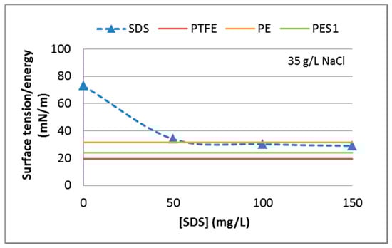 The critical surface tension for wetting, defined as the surface tension required to wet the membrane, is also indicated in the figure. Based on this figure, the PE membrane is expected to be wetted by the feed liquid if it contains 50 mg/L SDS or more. The surface energy of the PTFE and PES membranes is below the asymptotic value of the surface tension of the liquid up to 150 mg/L and therefore these membranes might be more suitable for treatment of surfactant containing waste streams.