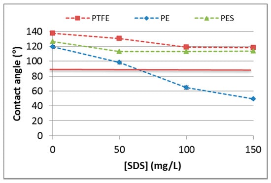 Figure 3 shows the contact angle of the three different membranes as a function of the sodium dodecyl sulfate concentration. The PTFE and PES membrane show contact angles above 90° for all SDS concentrations used in this study, whereas the contact angle with PE decreases below 90° for SDS concentrations above 50 mg/L. Based on these results, wetting is only expected for the PE membrane at SDS concentrations higher than 50 mg/L, which confirms the observations in Section 3.2.1.