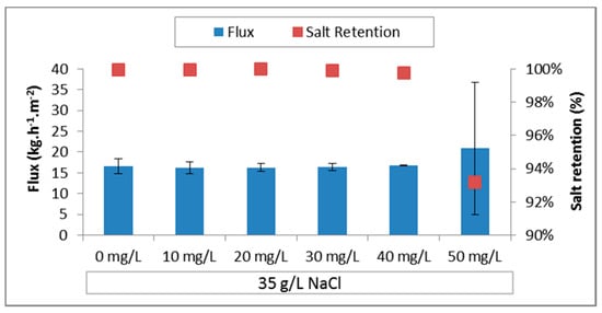 Figure 5 shows the average flux and salt retention of the PE membrane using different SDS concentrations. Up to 40 mg/L, the flux is unchanged and the salt retention remains sufficiently high (>99.9%). At 50 mg/L SDS, the flux increases steadily over time. During the first hour of the experiment at 50 mg/L SDS, the flux was relatively stable, at 17 kg·h−1·m−2, while the retention already decreased from 99.9% to 98.6%. These observations indicate wetting of a few membrane pores, enabling limited salt transport through the membrane. The fraction of dry membrane pores must be substantially high, because the flux is not affected and the salt retention remains above 98.6%. During the second hour of the experiment, the flux increased rapidly from 17 kg·h−1·m−2 up to 40 kg·h−1·m−2, while the retention decreased drastically from >98.6% to 69.5%, which indicates severe wetting of the PE membrane at these concentrations. The SDS concentration is not further increased above 50 mg/L, because even more severe wetting problems are expected. Based on the contact angle measurements, wetting would occur between 50 and 100 mg/L, while based on the LEP measurement, no wetting is expected up to 1000 mg/L. This shows that the contact angle and surface tension are more reliable measures for prediction of membrane wetting than the LEP. The short-term exposure LEP in Section 3.2.3 did not predict membrane wetting under these experimental condition, and is therefore found to be an unreliable measure for wetting prediction.