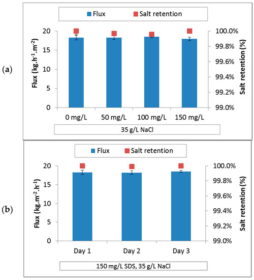 Flux and salt retention for the PES membrane, (a) with increasing SDS concentrations; (b) at constant feed composition over three days.