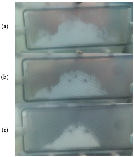 Pictures of the PTFE membrane during the experiment with oil/SDS mixture after (a) 4 h; (b) 5 h; (c) 6 h of MD operation.
