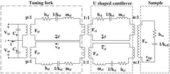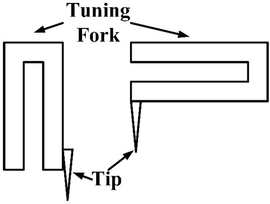 Quartz tuning forks are widely used in clocks, watches, and digital circuit frequency standards. By taking advantage of their extreme stability in frequency, their self-sensing and self-actuating capabilities, their high quality factor, and the ease with which the vibration signal may be obtained with fewer components than the conventional scanning probe microscopy (SPM) probes, etc., they can be used as force sensors in SPM [1,2,3,4,5]. The tuning fork probes are typically realized in two forms (Figure 1). The tip of the probe could be a carbon nanotube, an optical fiber, a conventional Atomic Force Microscopy (AFM) cantilever, or another type of stylus. With the development of some complex tuning fork probes [6,7], the quantitative use of the data (in terms of amplitude, phase, and frequency shifts) becomes challenging for these sophisticated probes. In this article, a kind of electromechanical coupling model with multistage coupling is proposed and used to describe a complex probe.