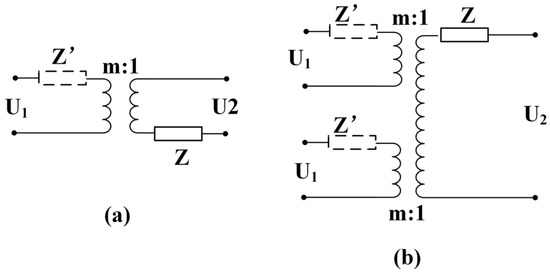 The coupling can be regarded as an ideal transformer. According to the principle of the ideal transformer as shown in Figure 2a, the equivalent impedance Z′ in the left part is: