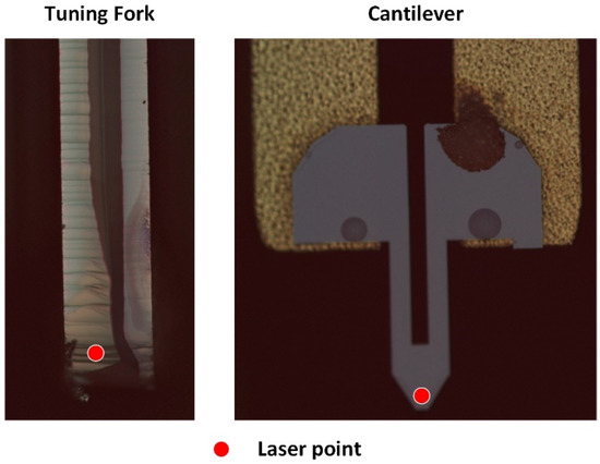 The calculation of the real probe’s electromechanical coupling factor uses the vibration amplitude of the tuning fork and the output current of the probe. The factor n is calculated by measuring the amplitude of the tuning fork and the cantilever. All the vibration amplitudes are measured by laser Doppler vibrometer (OFV-3001, Polytec, Waldbronn, Germany). The measured points of the tuning fork and the cantilever are shown in Figure 13.