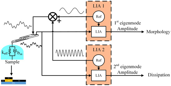The bimodal AFM measuring system based on the Akiyama probe shown in Figure 15 is built to utilize this feature to measure the power dissipation. Two lock-in amplifications (LIA) excite the probe and demodulate the output signal. The first eigenmode signal amplitude is sent to the feedback system to control the PZT (piezoelectric ceramic transducer) to keep the distance between the tip and the sample constant as normal tapping mode, the position of the PZT describes the morphology of the sample. The second eigenmode signal amplitude is recorded, as mentioned above, this is related to the power dissipation therein.